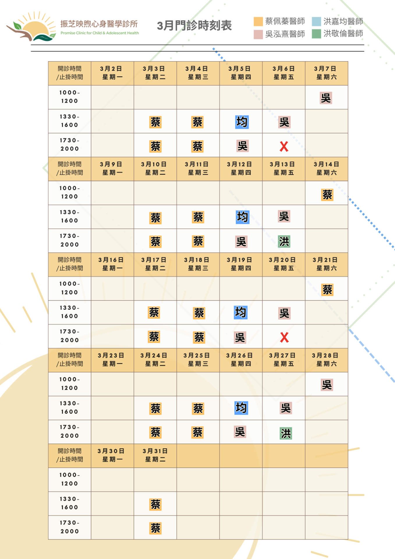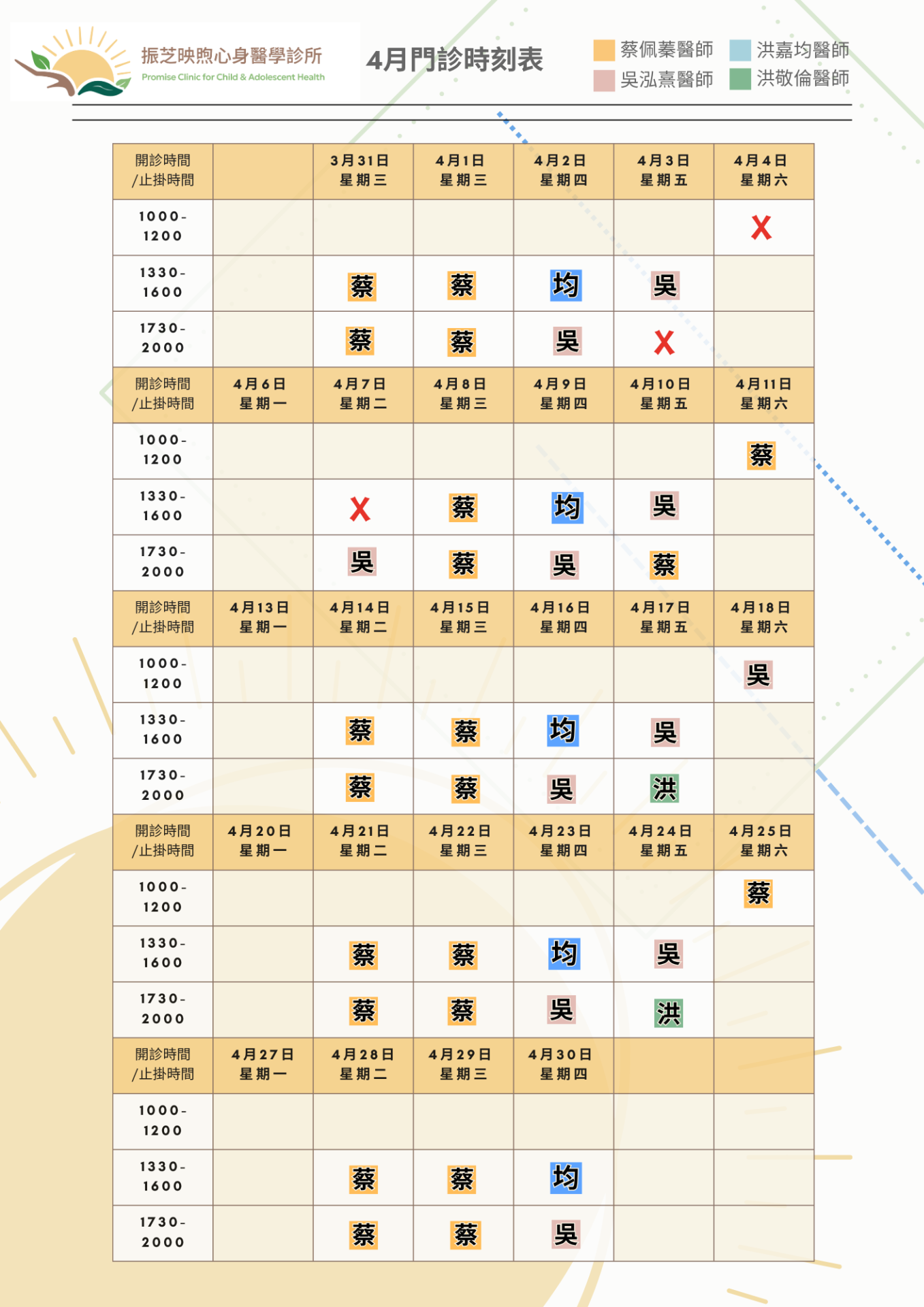 • *週六單周 吳泓熹醫師 / 雙周 蔡佩蓁醫師