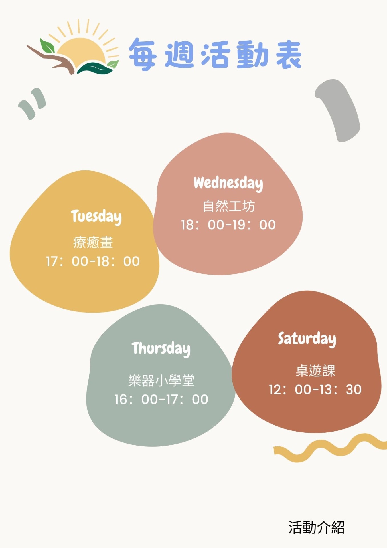 - 每週提供 5 個活動時段,主題包含藝術創作、音樂表達、桌遊互動、自然手作等,孩子可依自身興趣與狀態彈性參與。強調情緒表達、自我探索與人際互動能力的培養。